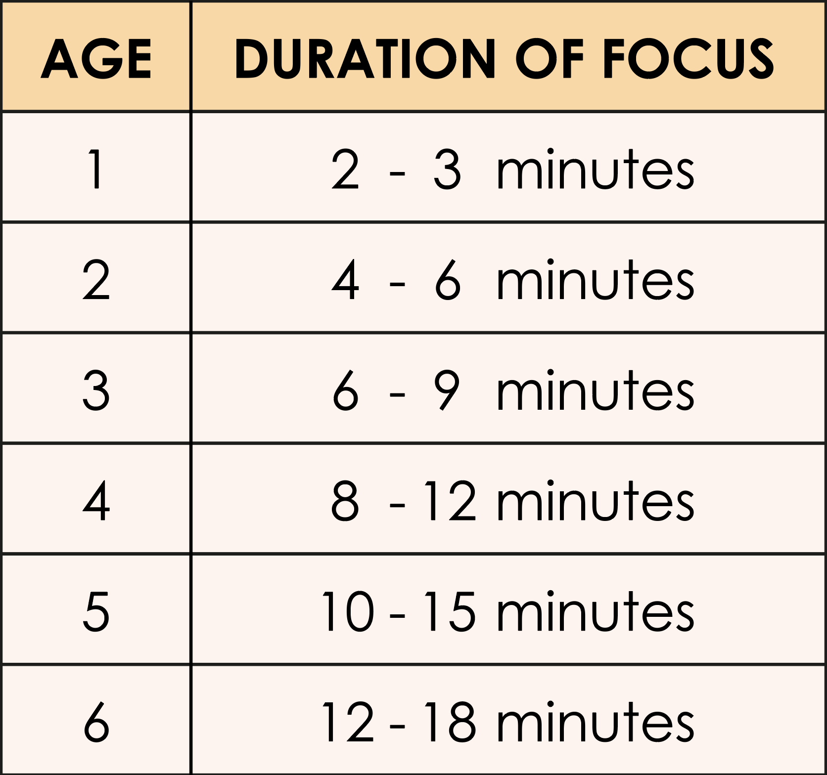 Have you ever told a child to focus but to no avail? This article will give you some insights on how long children’s attention span generally is, as well as ways to help them improve their ability to focus. First and foremost, a child’s maximum attention span is about two to three times his age; as such, a four-year-old child will be able to focus on an activity for about 12 minutes at most.